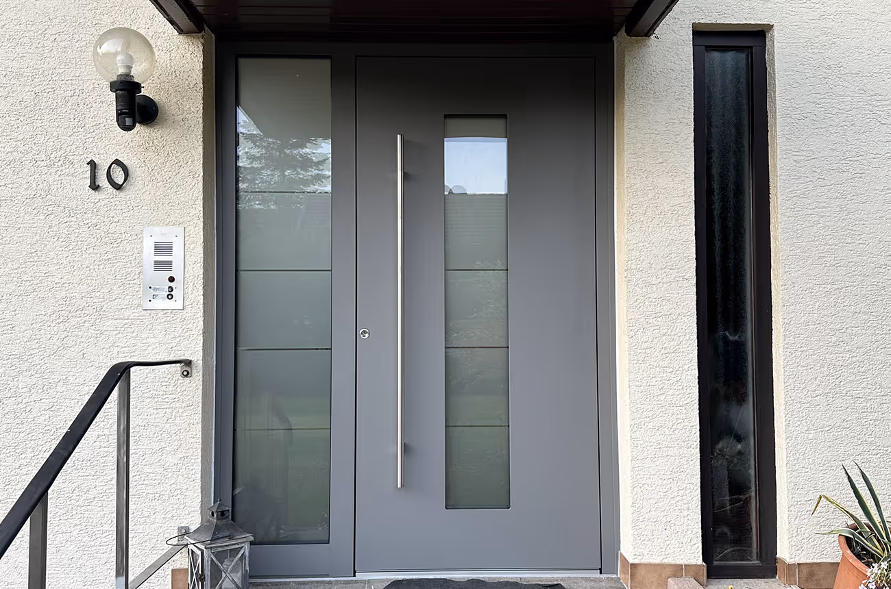 Im Zuge einer Sanierung/ Modernisierung ersetzten wir die in die Jahre gekommene Eingangstür durch ein modernes Haustürsystem. Das Ergebnis: ein geschützter, einladender Eingangsbereich mit klarer Linienführung und hoher Sicherheitsausstattung.