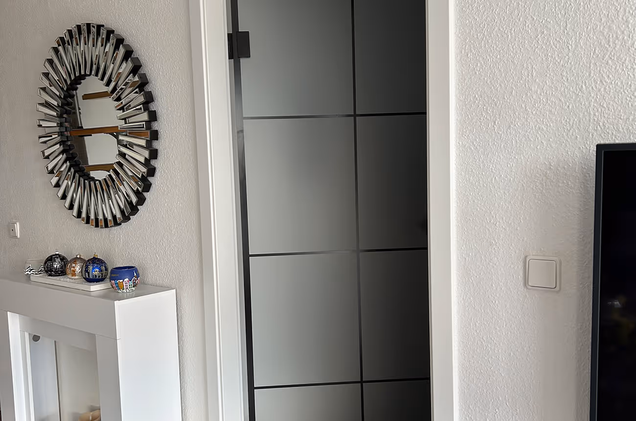 Ein stilvolles Türkonzept in Schwarz und Glas: Für eine Wohnung in Heddesheim wurden drei Bestands-Innentüren durch elegante Loftstil-Glastüren ersetzt, mit satiniertem Glas für Bad und Schlafzimmer und klarem Glas für den Flur. Schwarze Beschläge runden das komplette Design ab.
