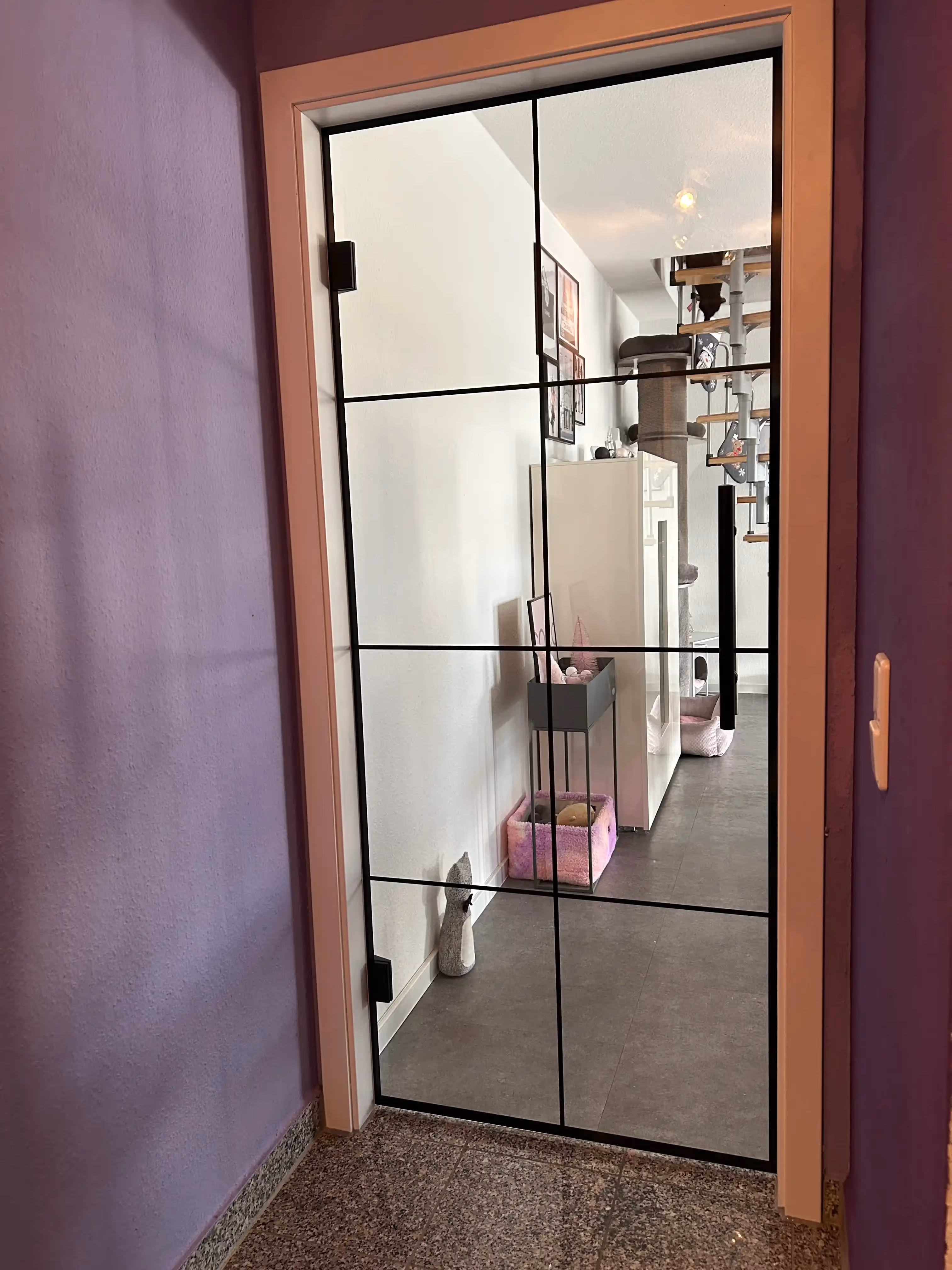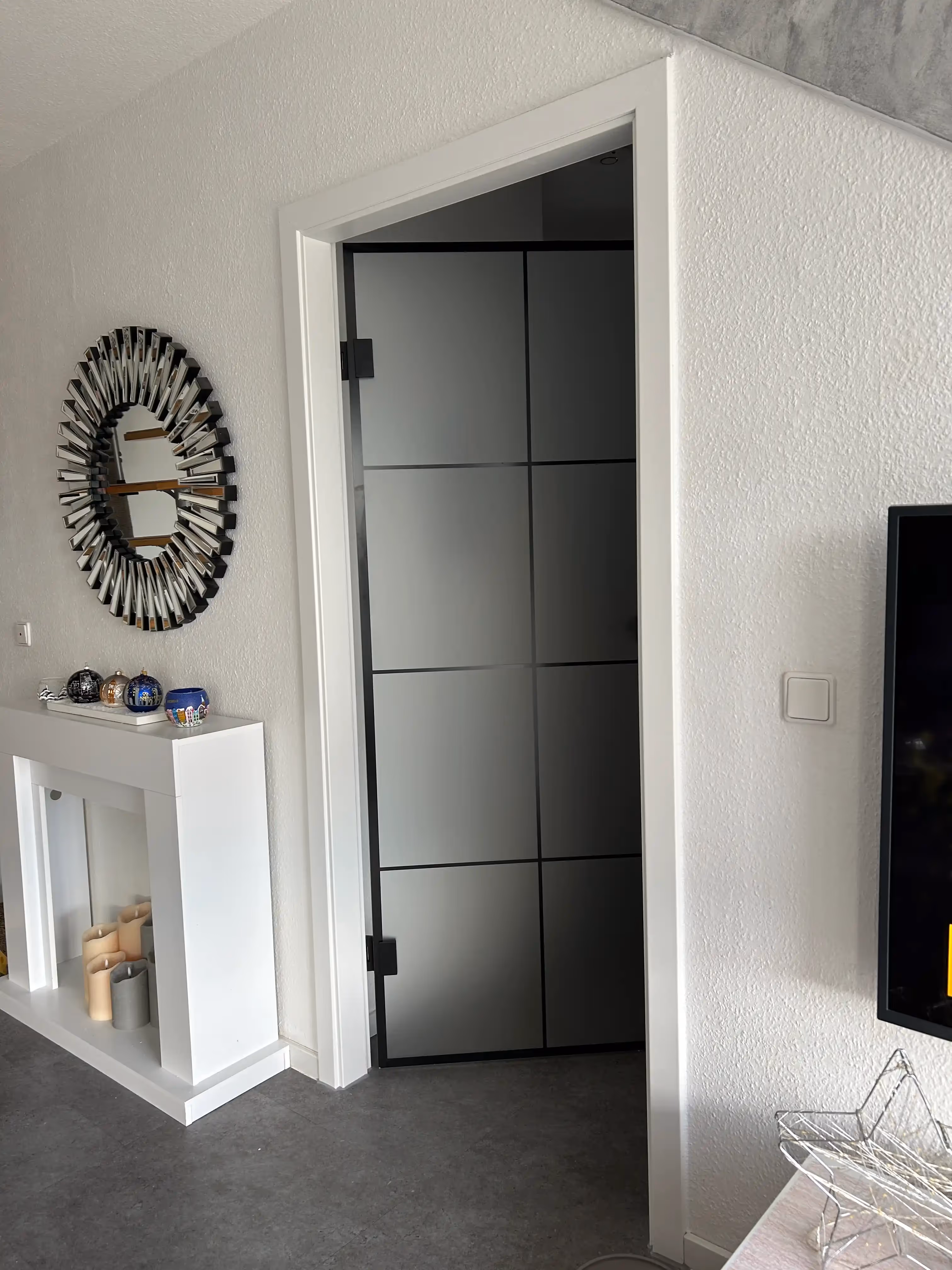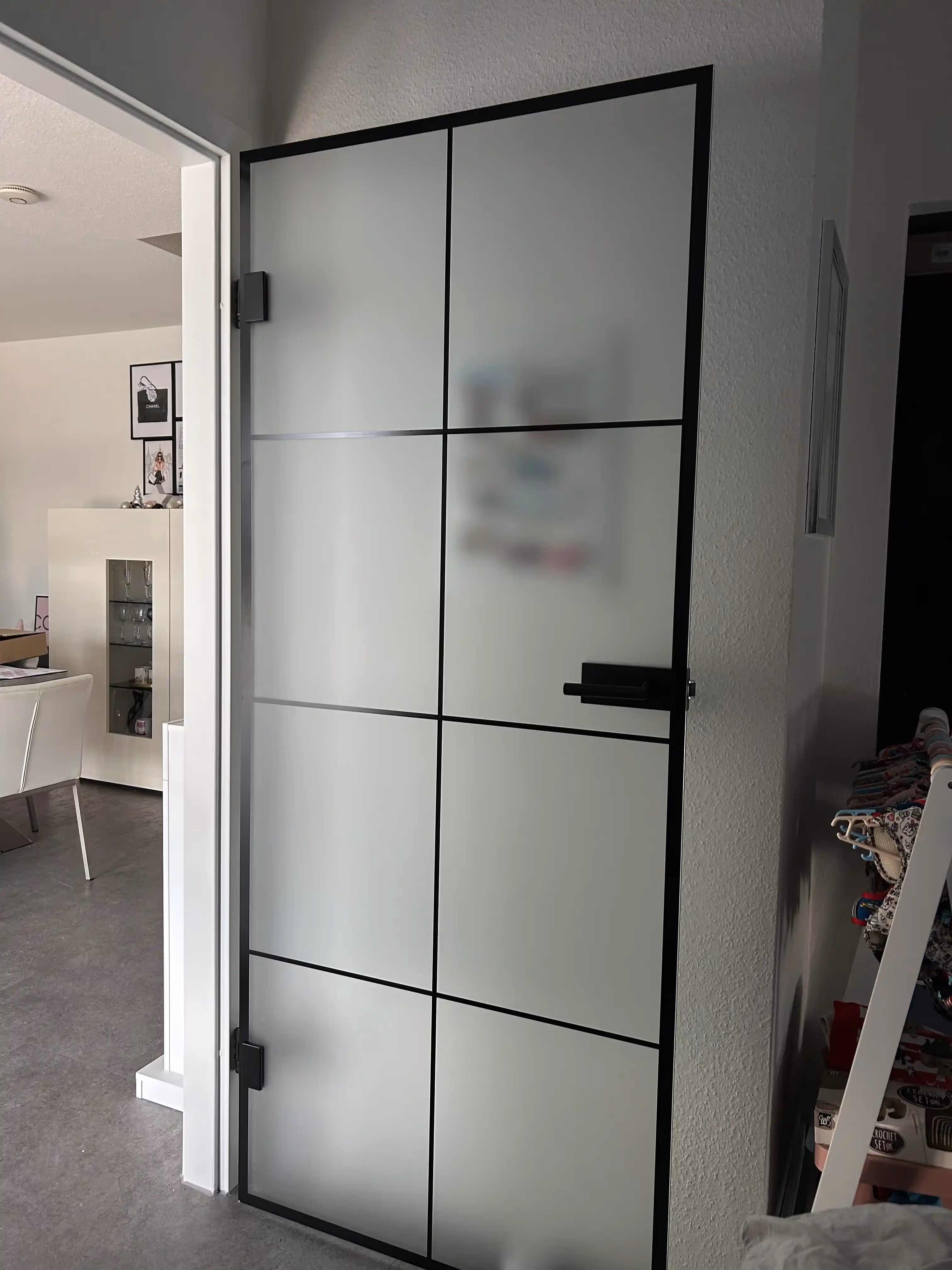 Modernes Loftdesign für den Innenbereich: Dieses Projekt zeigt, wie sich Stil und Funktion perfekt kombinieren lassen. Die beiden satinierten Glastüren sorgen für Diskretion in Bad und Schlafzimmer, während die transparente Variante mit elegantem Stoßgriff den Flur optisch öffnet. Der einheitliche Look mit schwarzem Rahmen auf den Türblättern und schwarzen Beschlägen unterstreicht das moderne Wohnambiente und sorgt gleichzeitig für Klarheit und Leichtigkeit im Raum.